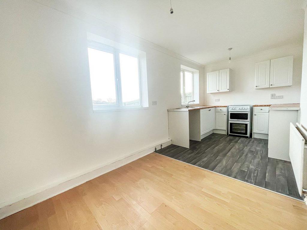 Kitchen/Diner benefiting from fitted wall and base units with contrasting work surfaces, plumbing for a washing machine and a free standing electric oven. Vinyl flooring, radiator, two double glazed rear aspect windows and a door leading to the garden