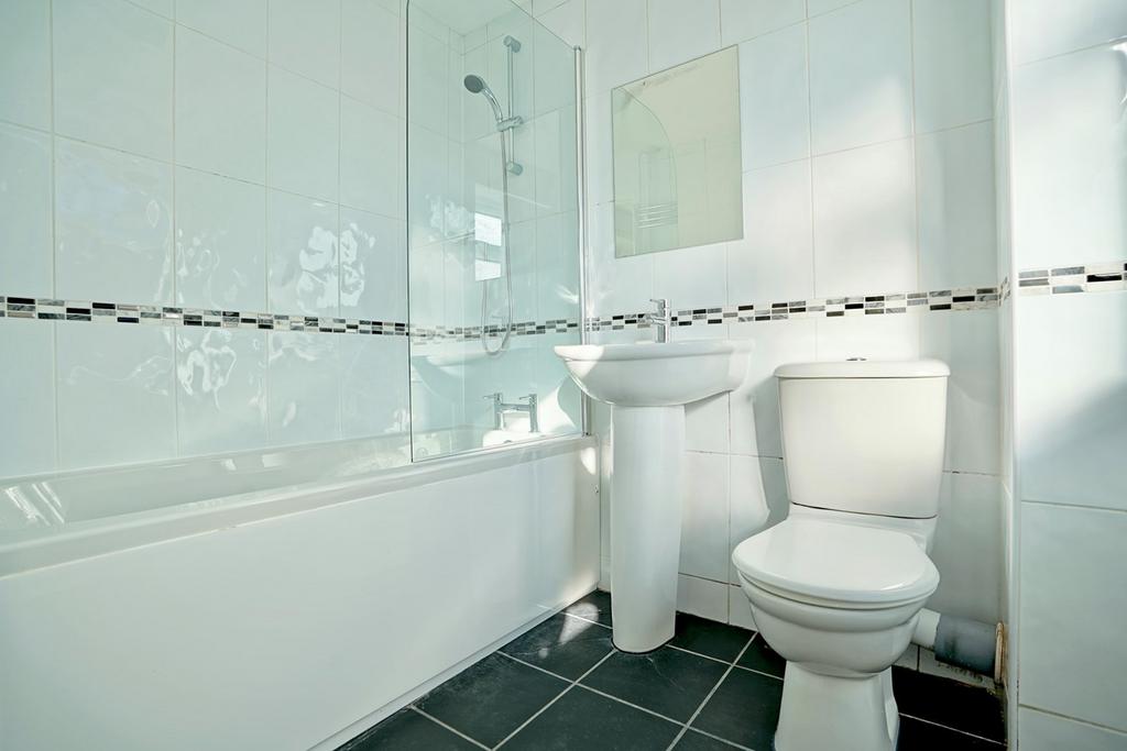 Re-fitted in a three piece contemporary white suite comprising low level WC, pedestal wash hand basin with mixer tap, panel bath with folding screen and mixer tap with independent shower unit fitted above, chrome heated towel rail, UPVC window to side aspect, full ceramic tiling with glass contour border tiling, ceramic tiled flooring.