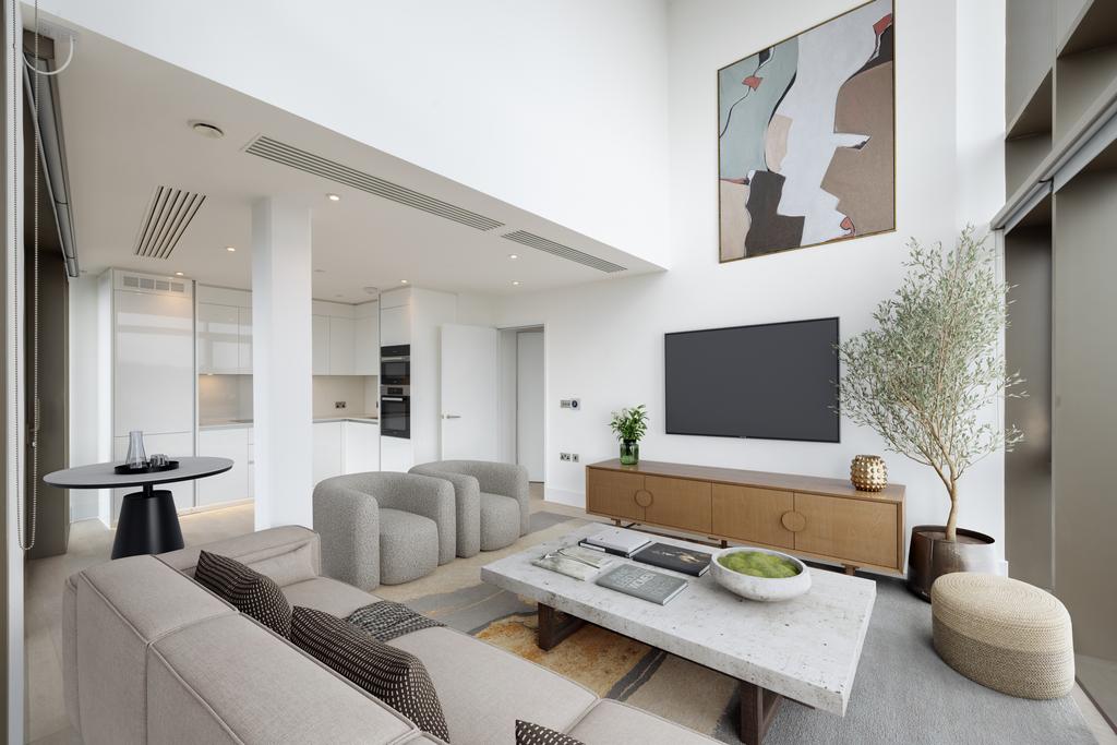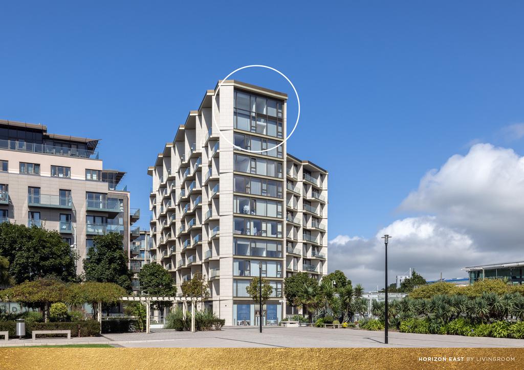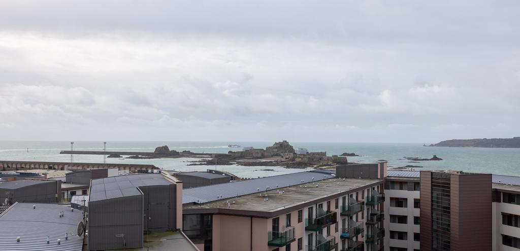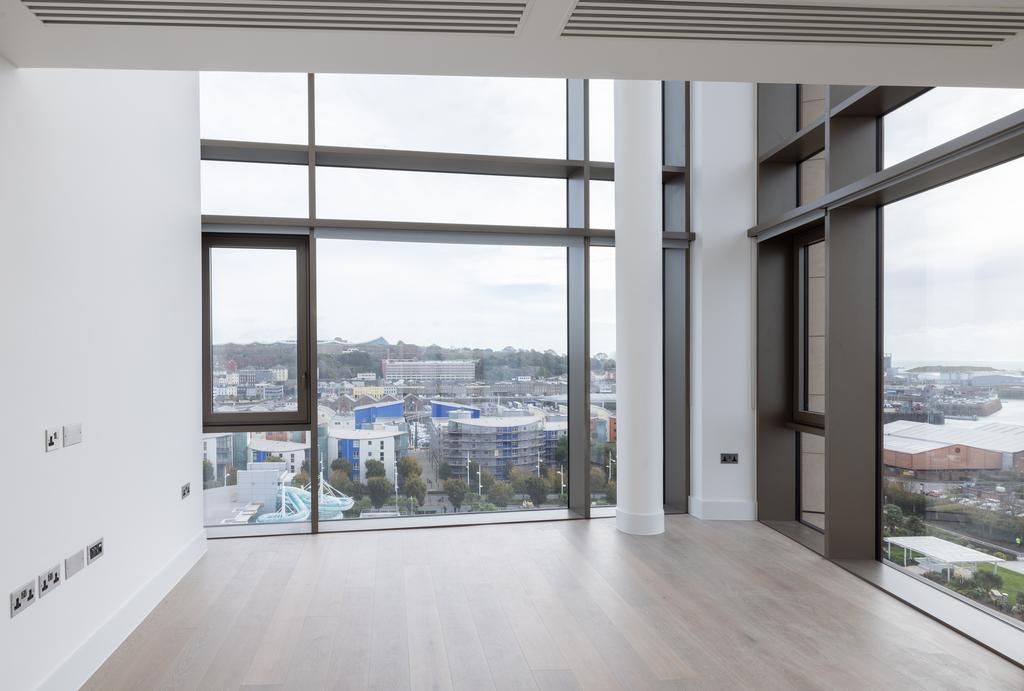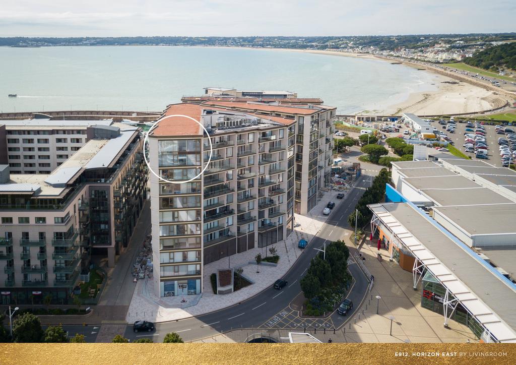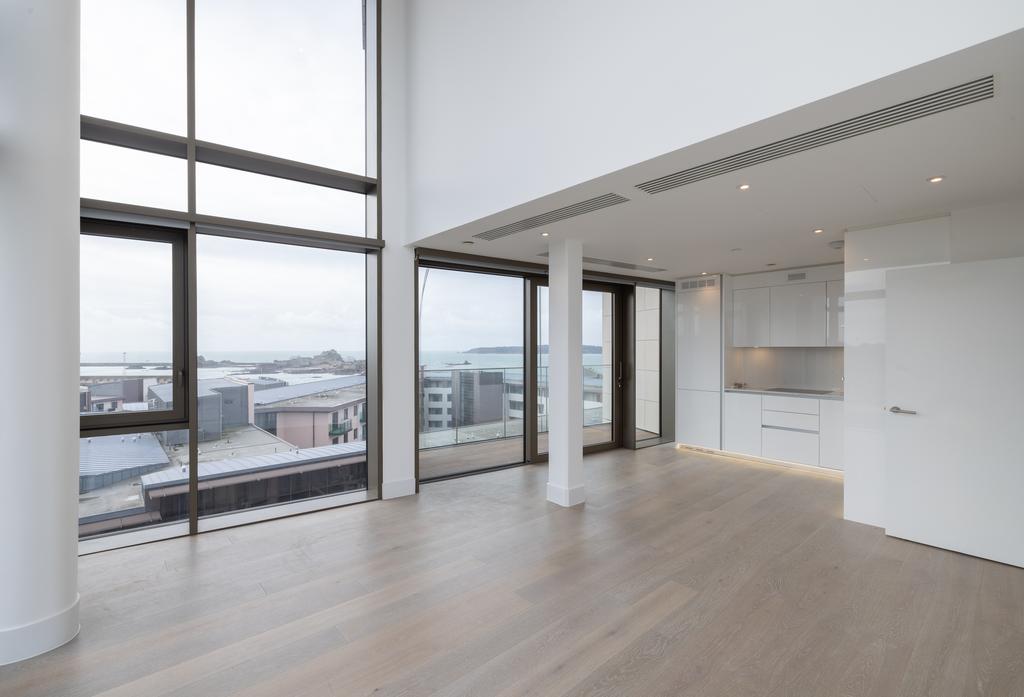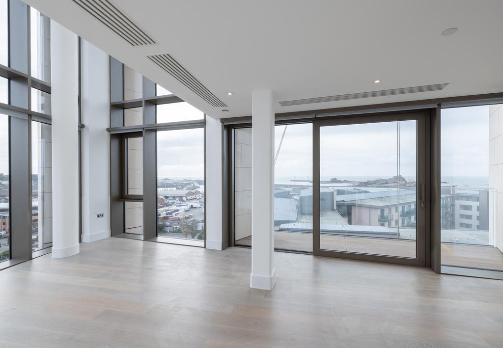 Livingroom is delighted to offer this duplex apartment 912, situated over the ninth and tenth floors of Horizon East. Elevated and occupying a corner position above Castle Quay, it offers incredible panoramic south-facing views over Elizabeth Castle and beyond. This 1,182 sq. ft three-bedroom home boasts voluminous ceiling heights with floor-to-ceiling glazing, flooding the apartment with an abundance of natural light.
