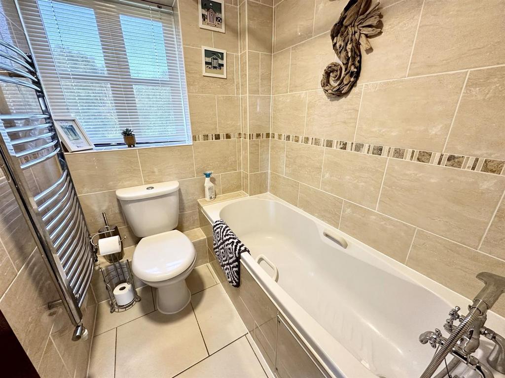 Bathroom - Window to rear aspect, fully tiled walls an floor, ventilation, tiled in bath, with mixer tap with shower attachment, low level WC, hand wash basin within a fitted vanity unit, heated towel rail.