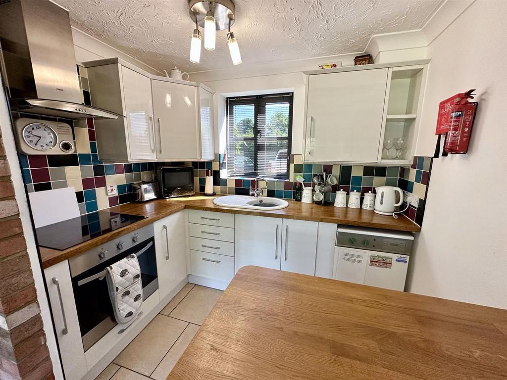 Kitchen - 8' 5'' x 5' 9'' (2.57m x 1.76m) - Window to front aspect, tiled flooring, a range of modern fitted kitchen units with solid wood work surface and breakfast bar, ceramic sink drainer with mixer tap, integrated oven and ceramic hob and stainless steel chimney extractor, oil-fired boiler for hot water and central heating, integrated fridge.