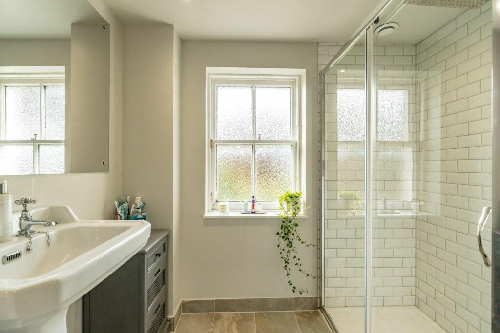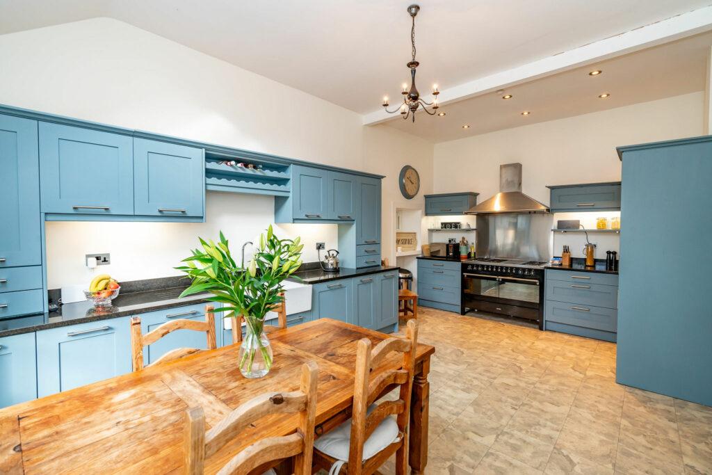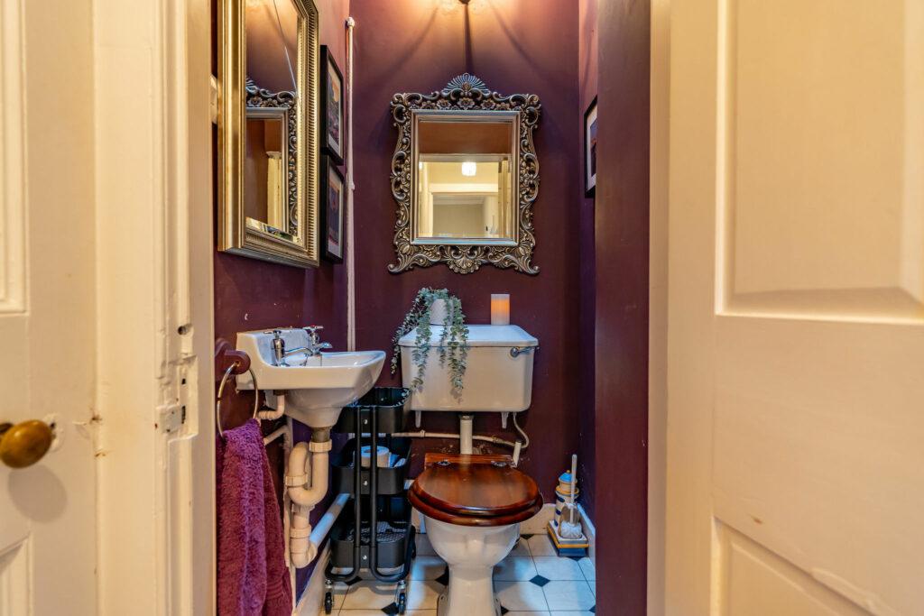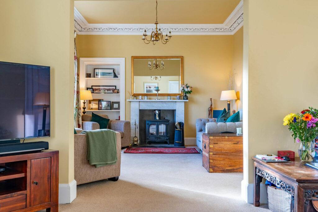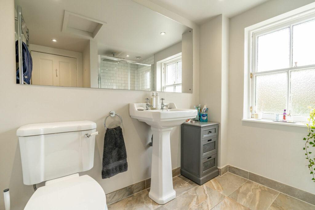 Upon entering through the charming, tiled hallway, you are welcomed into the main house, where a grand living room/sitting room awaits. Adorned with a multi-fuel fire and breathtaking original cornicing, this space offers panoramic views of the village. The lower level features a separate dining room/home office, complete with a second multi-fuel burning stove. The expansive family dining kitchen, perfect for entertaining, seamlessly connects to the rear patio. Rounding out the ground floor are a convenient WC and utility room.