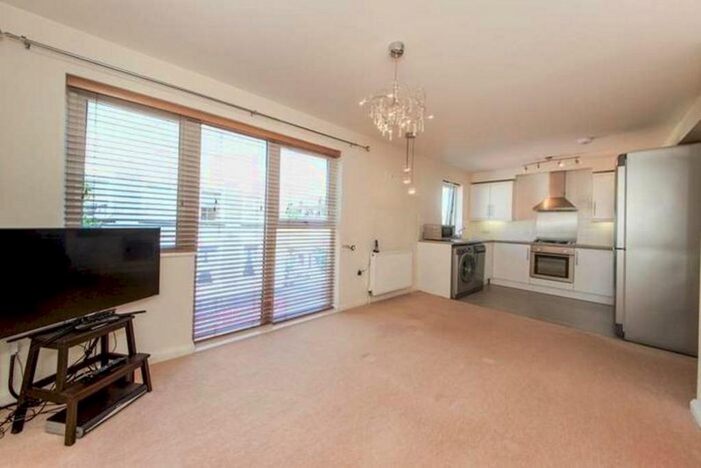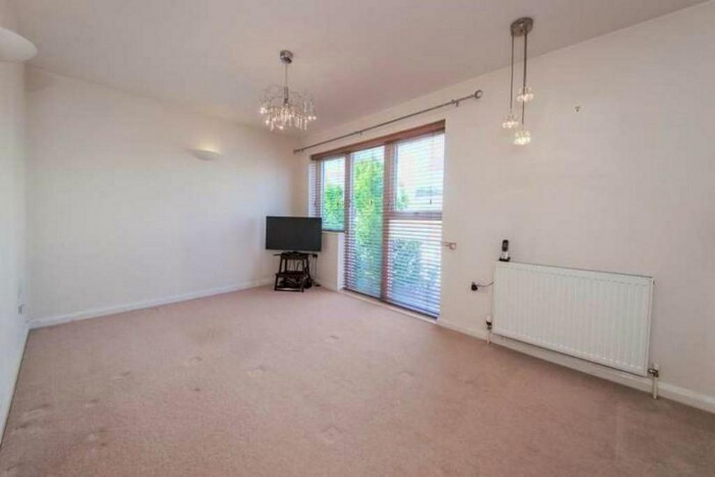 - Living Room: Spacious living area with a large storage cupboard, lots of natural light and full-length window leading to a modern open-plan kitchen. Carpeted flooring.