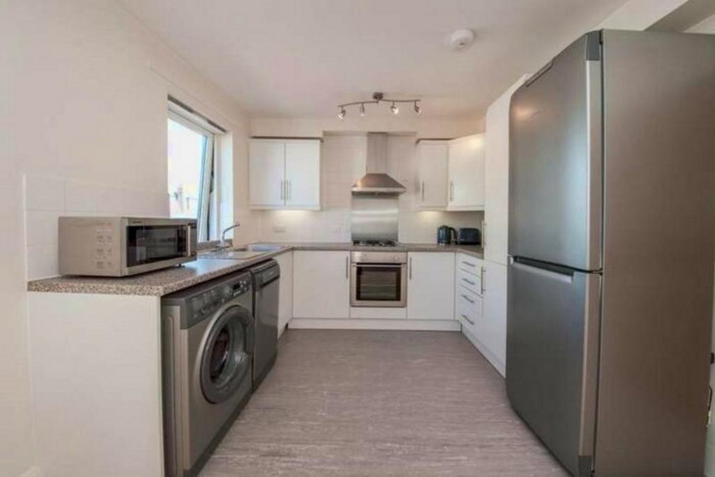 - Kitchen: White base and wall units with dark grey worktop and tile backsplash and stainless-steel behind hob. Integrated hob, oven. Large windows, space for a dining table. Light grey linoleum flooring