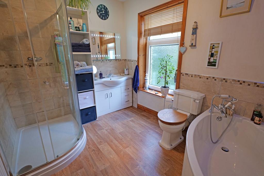 The larger than average, attractively refurbished bathroom is fitted with a four piece white suite, comprising a corner bath, which has a tiled splash-back and a mixer tap with a hand-held shower attachment, a w.c. and a vanity wash hand basin, with a cabinet below, incorporating a cupboard and drawers, and an illuminated mirror above and tiled splash back. There is also a separate, fully tiled, larger than standard shower cubicle, with a 'rainfall' style shower, down-lights recessed into the ceiling and also speakers, which can be connected via Bluetooth, a pvc double glazed, frosted glass window and wood finish laminate flooring. Access to the loft space is gained from the bathroom, via a retractable metal ladder, and the loft has an electric light.