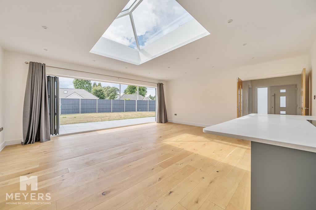 Double glass doors lead to a stunning, open-plan dual aspect kitchen/dining/family room with 16ft double glazed bi-fold doors which open to the landscaped gardens with an 8ft ceiling atrium-style skylight which floods this fantastic space with lots of natural light, with wood flooring continuing throughout.
