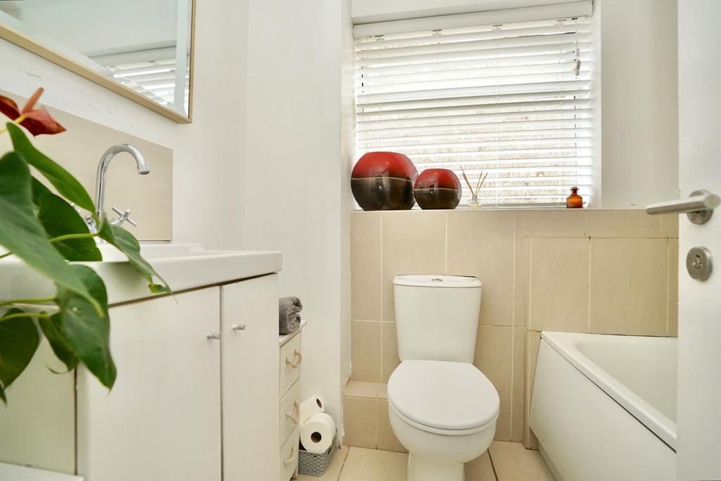 Re-fitted in a three piece white suite comprising low level WC, panel bath with folding shower screen and mixer tap with multi head shower attachment, UPVC window to side aspect, vanity wash hand basin with mixer tap and cabinet storage, porcelain floor tiling.