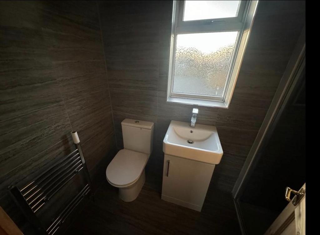 Beautiful 3 Piece White Bathroom Suite With Low Flush WC, Pedestal Sink & Shower Cubicle. Grey Marble Affect Cladding To The Walls & Grey Laminate To The Floor. Towel Radiator & uPVC Double Glazed Window.