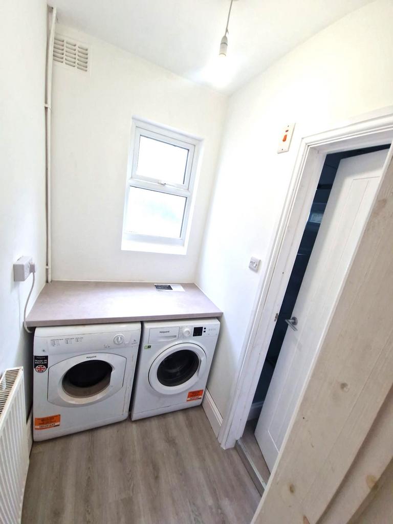 Separate utility area with washing machine, tumble dryer and storage cupboards.