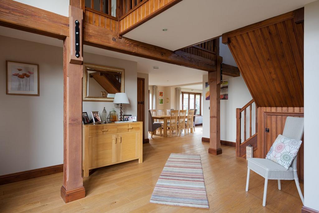 Attractive brick paviers lead through the cart lodge to the utility room as well as to the glazed front doors, through which light floods into the hall. As soon as you step onto the oak floor, the feeling of space and light is palpable. Glance up past the galleried landing, the beautiful glass chandelier lighting up the vaulted ceiling and magnificent timberwork. What an entrance!