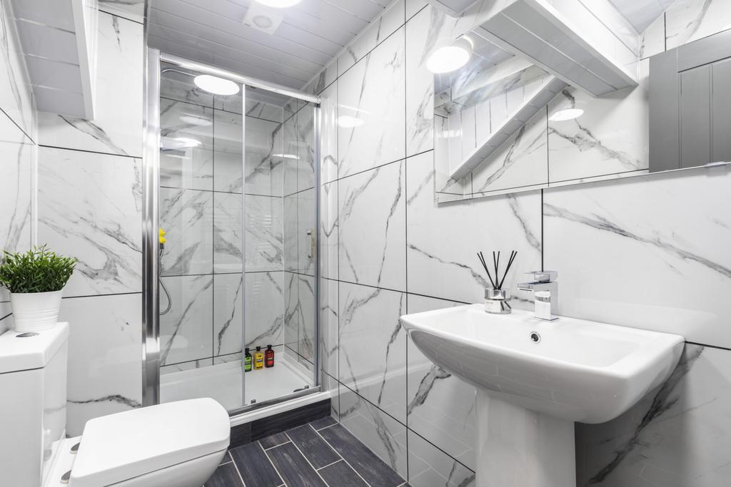 1 large fully tiled modern bathroom that comes with a beautiful rainfall shower.