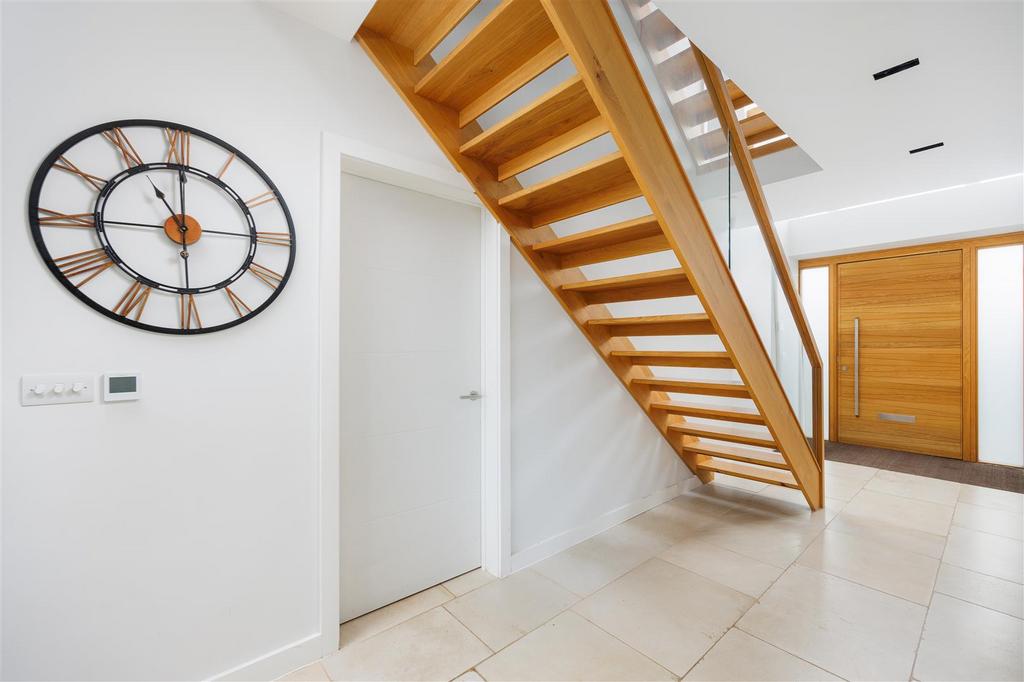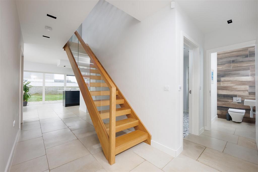 With over 2,500 square feet of living space, the property is thoughtfully designed to maximise light and space. A standout feature is the oversized high ceilings on the ground floor, enhancing the sense of openness throughout. The large entrance hall provides an impressive introduction, flooded with natural light from a striking two-storey gabled window above the front door. The entrance hall flows seamlessly into the kitchen and showcases a bespoke timber and glass staircase. Doors lead off to the lounge, utility room, ground-floor shower room, and a separate WC.