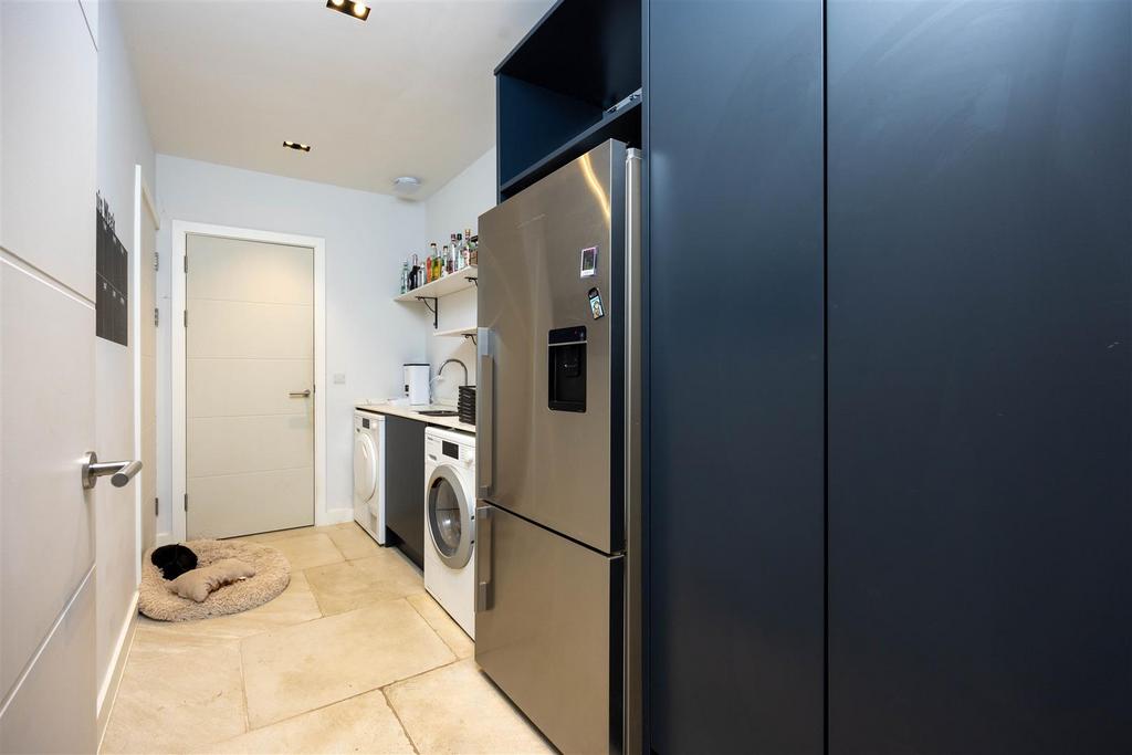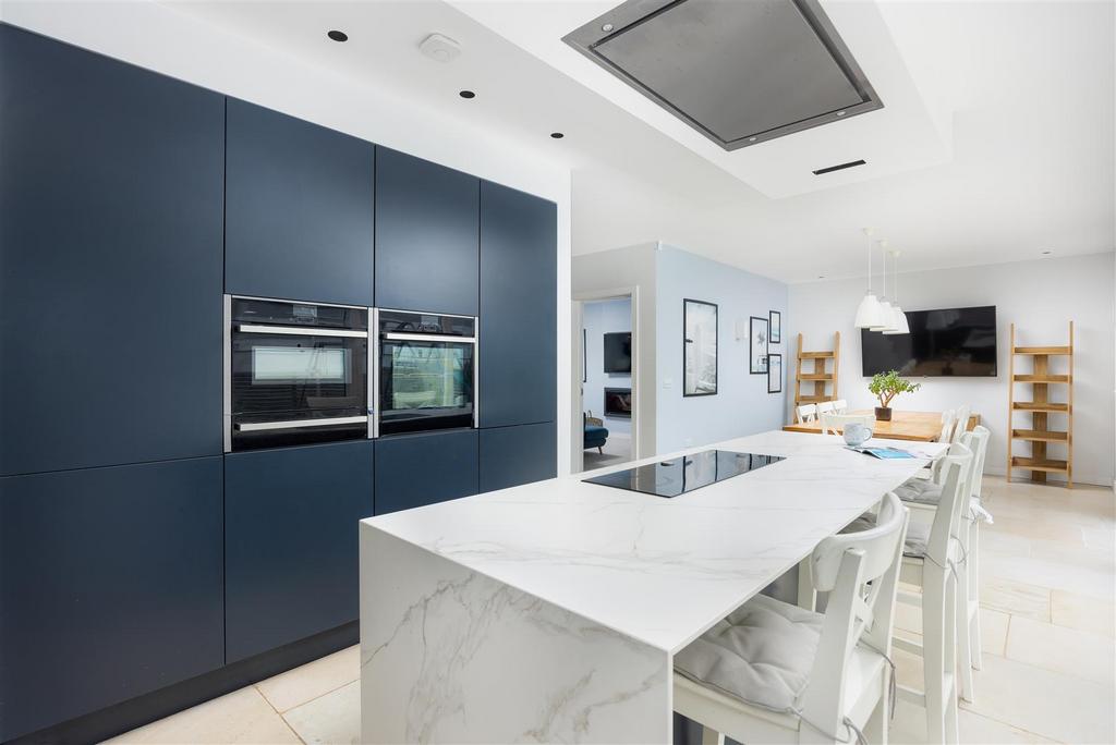 The stunning 29’9" open-plan kitchen and dining area is positioned at the rear of the ground floor, featuring a contemporary navy-blue fitted kitchen and direct access to the garden via sliding doors. The spacious lounge at the front of the property includes a contemporary fireplace and two large windows.