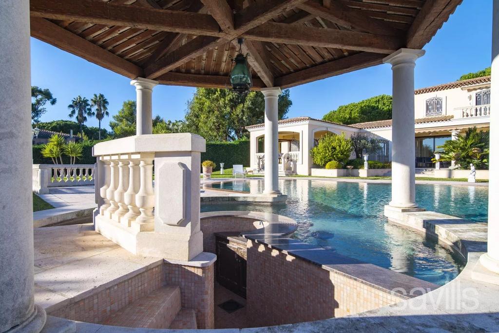 Ideally located on the west side of Cap d'Antibes, within a small gated estate, this Provençal style property enjoys a privileged location near the sandy beaches. A villa of approximately 350 sq m features on the ground floor: an entrance hall, a guest toilet, a reception room with lounge, dining room, fireplace and a separate kitchen. Three suites with dressing rooms and bathrooms and a bedroom with an en suite bathroom and a study complete this level. A further spacious suite with dressing room and bathroom is located on the first floor. A basement comprises a cellar, a laundry room and a garage for four cars. Landscaped grounds of approximately 2,600 sq m with swimming pool and bar, plus numerous terraces complete this property. Please note, the map does not show the exact location of the property and all measurements are approximate, this data is provided for guidance purposes only.