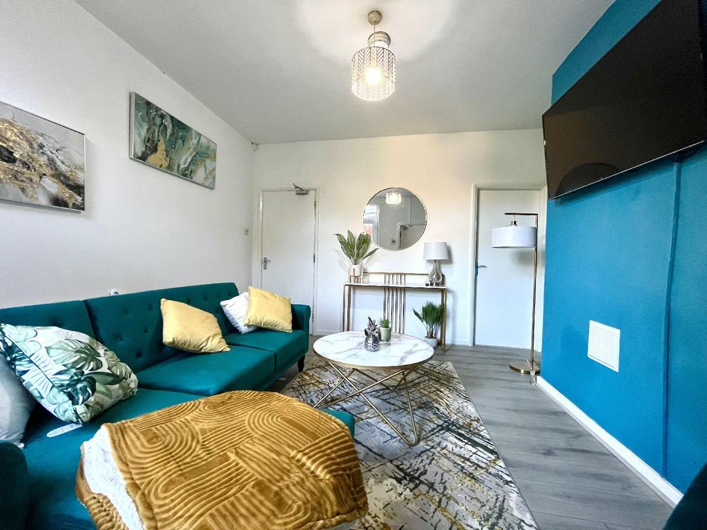 The lounge is now made up on a teal coulour corner sofa, marble affect coffee table, a large 55 inch smart TV and wall art. The kitchen has had all new grey speckled work tops and cupboards installed with a brand new microwave.