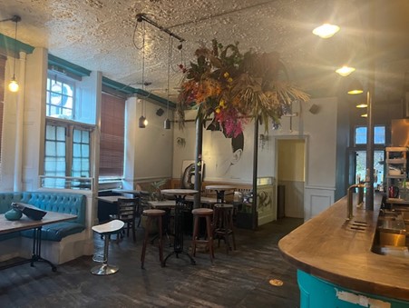 The ground floor has a shop front entrance which provides access into the sitting area along with built in kitchen and bar while to the side there is a small garden for outside seating which is accessed from ground floor level.