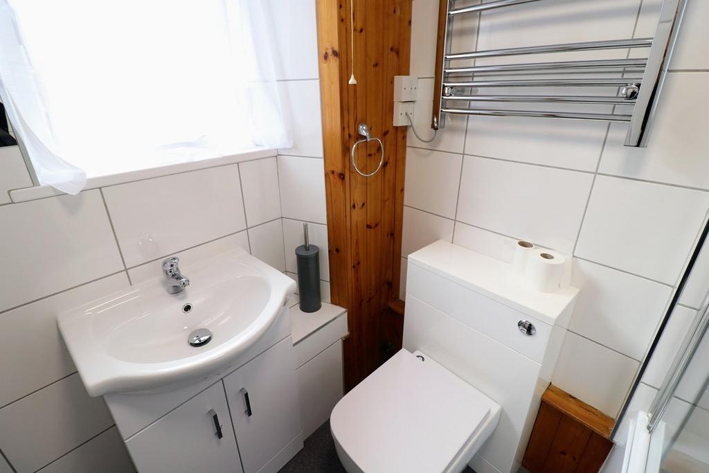 A fully tiled bathroom with window to side aspect, heated towel rail, extractor fan, laminate flooring and three piece suite comprising bath with electric shower over and fitted shower screen, wash hand basin set on vanity unit, and WC.