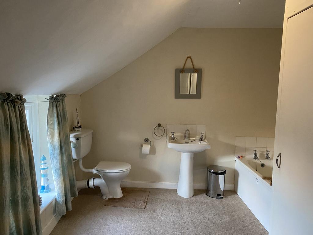 Bathroom (4.28m x 3.08m) with PVC frame double glazed window, white panelled bath, WC, pedestal wash basin, shower cubicle with Mira Sport electric shower, cupboard housing hot water cylinder heated by electric immersion heating element, carpeted floor, chrome heated towel rail.