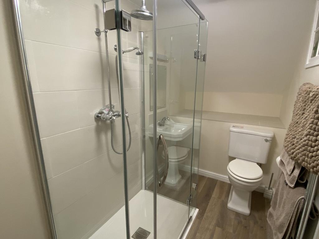 Shower Room (3.61m x 1.58m) with WC, pedestal handwash basin, shower with glass surround, chrome heated towel rail.