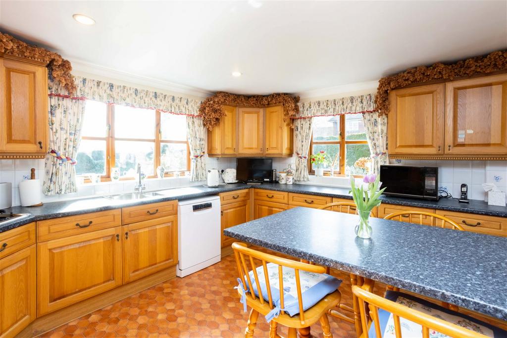 Dual aspect with double glazed windows to the rear and side. Wall and base kitchen units. Built in 'Neff' double oven and grill. Four ring gas hob with extractor hood over. A one and a half bowl stainless steel sink with drainer and swan neck mixer tap. Integrated fridge. Space and plumbing for dishwasher. Coved ceiling. Tiled splash back. Entrance to utility room.