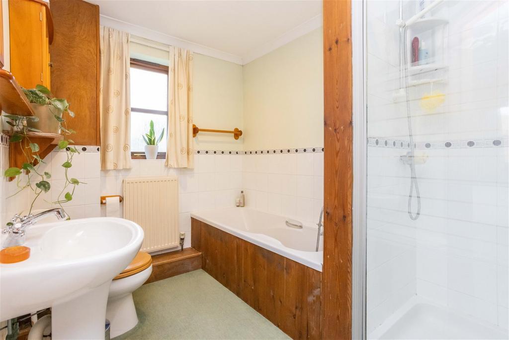 Opaque double glazed window to side. Walk in shower cubicle with tiled splash back. Panelled bath with telephone style mixer taps and hand held shower attachment. Low level WC. Wash hand basin. Coved ceiling. Radiator.