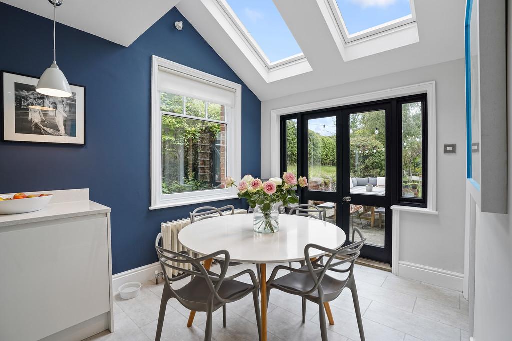 In detail, the property comprises an entrance hall with original wood flooring, access to storage cupboard, window to side aspect, stairs rising to the first floor and doors to the adjoining rooms. The cloakroom comprises W.C and wash hand basin. To the right sits the charming study with cast iron fireplace and bay window overlooking the green. The sitting room also benefits from views over the green with feature stone fireplace and double doors opening into the stunning garden room. Filled with natural light from the vaulted ceiling, triple aspect windows and patio doors leading onto the rear garden. The dining room also features a log burner with wooden mantle, fitted storage cupboards and wooden flooring, leading to the kitchen/breakfast room. The dual aspect kitchen/ breakfast room is the real hub of the home which is fitted with an extensive range of matching eye and base level units with contrasting shades and stone worksurface over and under mounted sink. Integrated appliances include two ovens, one Neff 'slide and hide' door and the other with a warming draw underneath, induction hob, dishwasher, fridge and freezer. There is ample space for a dining table with doors leading onto the rear garden and two Velux windows flooding the room with natural light.