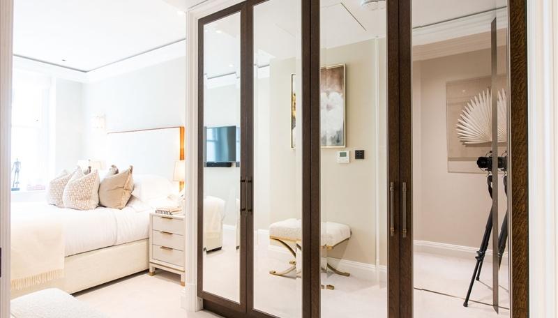 The primary bedroom has a range of built-in wardrobes, a full marble en-suite bathroom with underfloor heating, mirror-fronted cabinet units with integrated demister, and a door leading to the private courtyard. The second bedroom also offers a range of built-in wardrobes and an en-suite marble shower room.