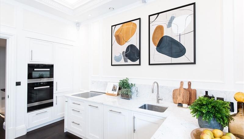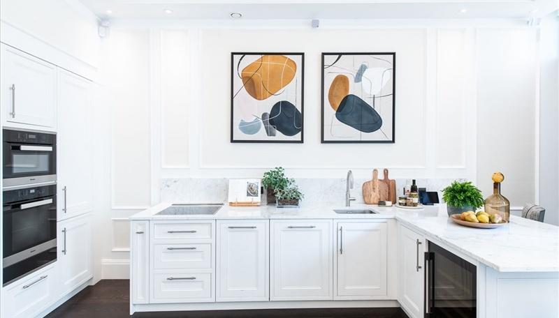 The hand-built kitchen features bespoke Calacatta marble from Italy and is equipped with Miele appliances: an oven, warming drawer, microwave, induction hob, wine cooler, and dishwasher.