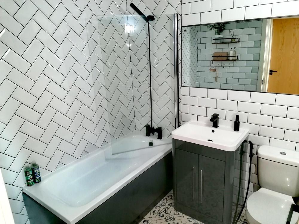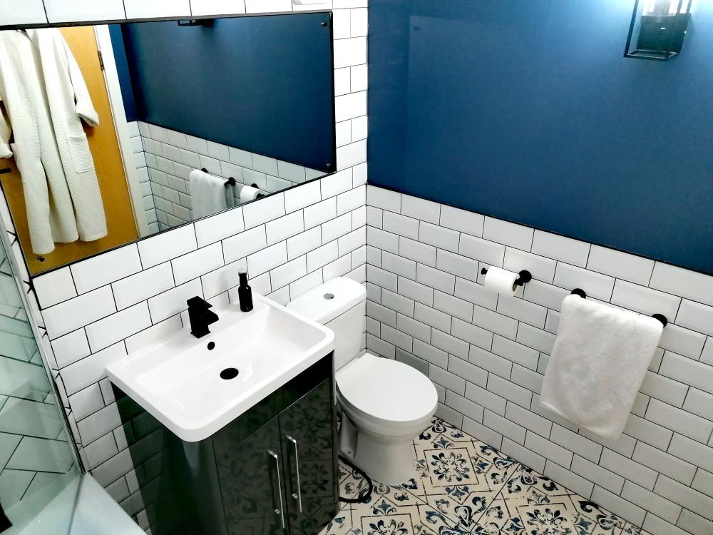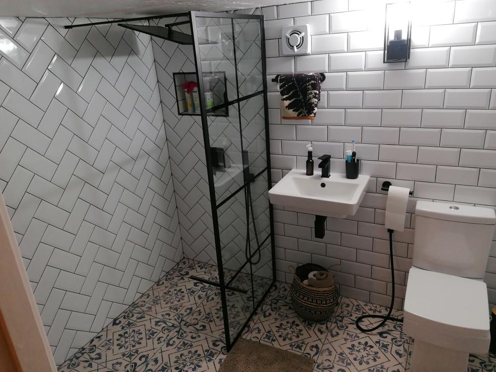 Three piece bathroom with tiles walls and floors, W/C and bath tub with over head shower.