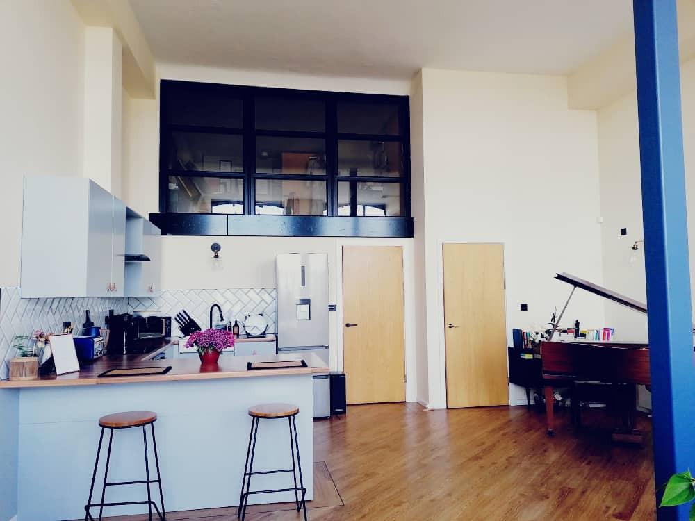 The open plan living & dining area consists of triple-height ceilings, laminate floor, painted walls as well as a kitchen area consisting of wall and base units with contrasting work tops.