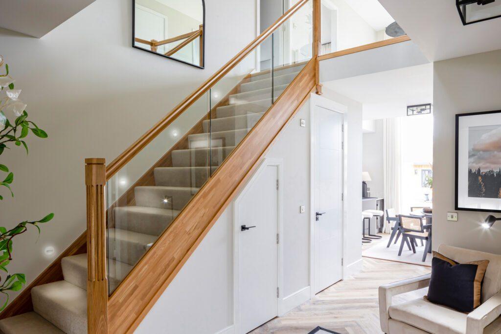 The Spence is a stunning five-bedroom villa designed to offer truly luxurious living accommodation. The generous lounge features a double aspect corner window and access to the spacious hall through double doors. The family room to the rear has a single sliding panel door through to the dining room/kitchen. The high-specification kitchen includes fully integrated appliances including oven, induction hob, fridge-freezer and dishwasher. The dining area features a magnificent double-height window, which extends to the mezzanine on the first floor allowing in plenty of light when enjoying a family meal or entertaining. There is also access, via a sliding glass door, to the garden from the dining area. Beyond the kitchen is a separate utility room and access to the integrated garage. A cloakroom and plenty of storage complete the ground floor.