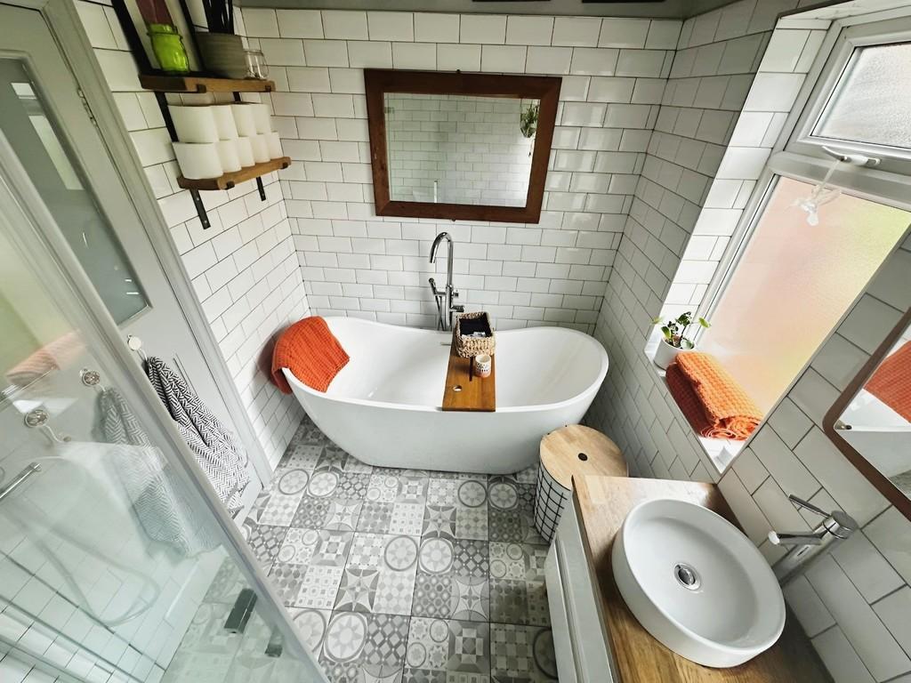 BATHROOM 8' 7" x 6' 4" (2.62m x 1.93m) Having a walk-in shower, free standing bath, ceiling spotlights, low level wc, wash basin, radiator and under floor heating.