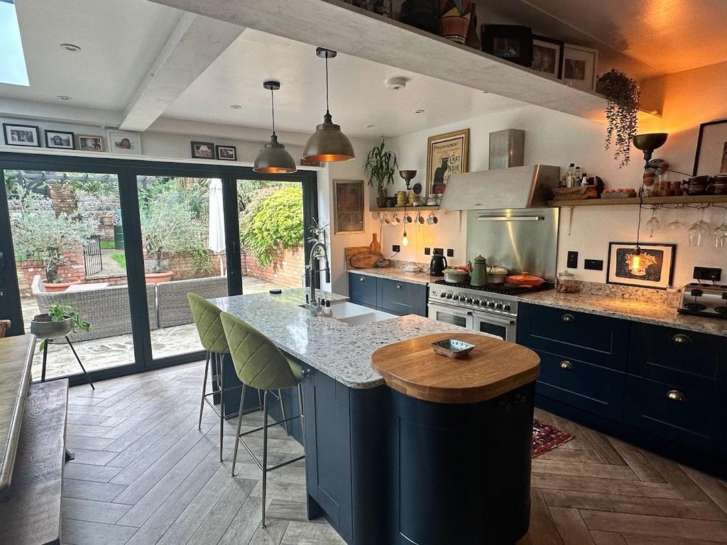 OPEN PLAN KITCHEN/DINING AREA 19' 7 max" x 20' 10 max" (5.97m x 6.35m) Having underfloor heating, power points, log burner, bi-fold doors, sky light, ceiling spotlights, Belfast sink, cooker, integrated fridge and freezer and a variety of base units.