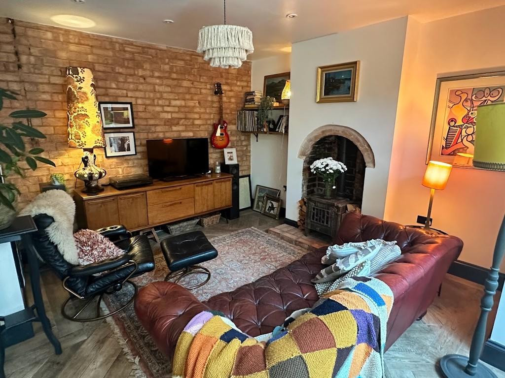 LOUNGE 14' 6 max" x 14' 2 max" (4.42m x 4.32m) Having double glazed bay window, ceiling light, power points, log burner and reclaimed mahogany wood flooring.