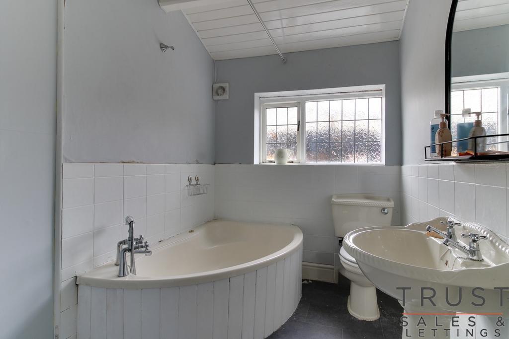 Up to the first floor landing where all three bedrooms and the house bathroom are accessed. Two of the bedrooms are very good sized doubles, and the third is a single. Benefitting from three bedrooms there is the potential for a work from home space for those that require it. The house bathroom, with corner bath and mixer tap shower head is a very good size and could easily house a separate walk in shower is desired.