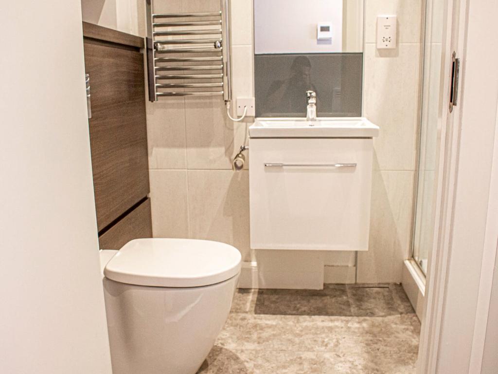 The spacious and modern bathroom is fitted with tiles throughout, shower, heated towel rail and integrated bathroom storage for your comfort and convenience.