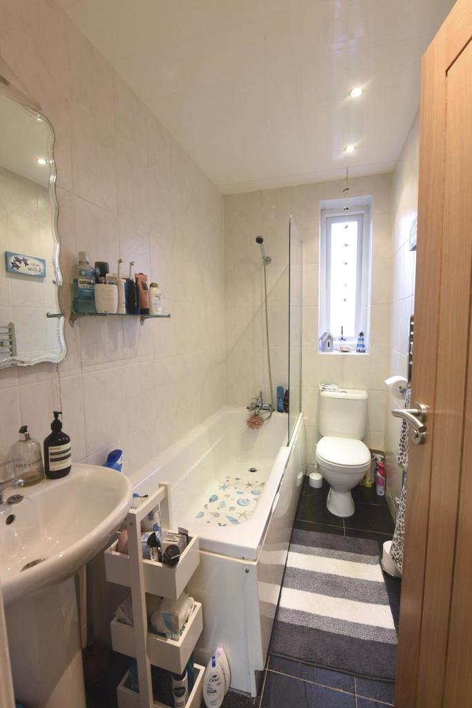 Comprising of bath with overhead shower, sink and WC, tiled flooring, towel radiator, UPVC ceiling with inset spotlights and UPVC double glazed window.