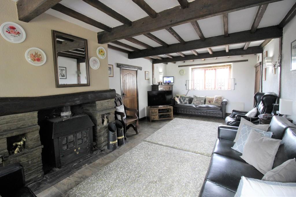 LOUNGE 23' 1" x 12' 0" (7.04m x 3.66m) A very spacious lounge with two windows to the front and rear elevations with far reaching uninterrupted countryside views, storage heater, open fire set within stone fireplace and wooden lintel, TV aerial point, feature beams to ceiling, internal door to kennels, 4 x wall light points.