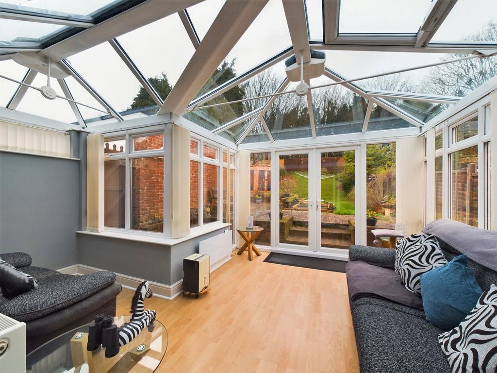 LARGE MODERN CONSERVATORY Comprising pvcu double glazed windows and doors, laminate flooring, radiator, two wall mounted lights.
