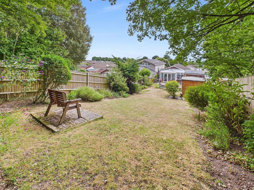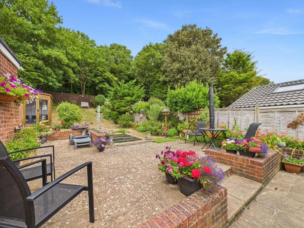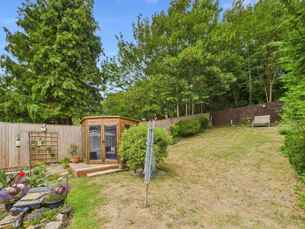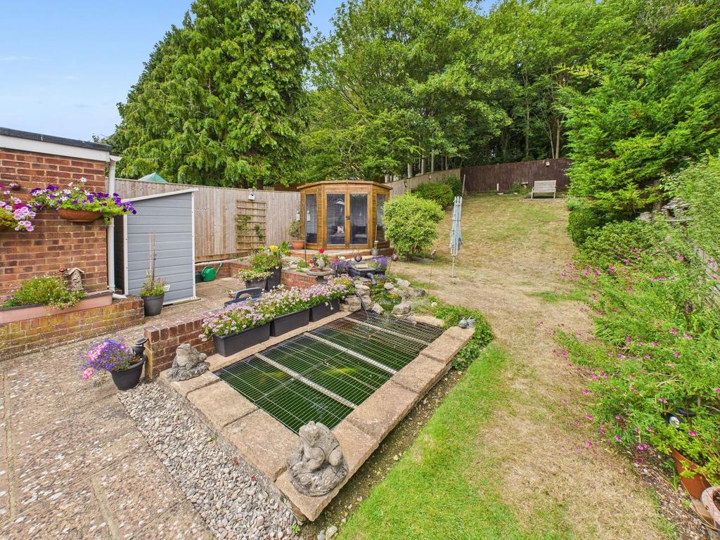 LARGE SUN TRAP REAR GARDEN Large block paved onto large lawned area having various mature shrub, tree and plant borders, sunken pond with built in filter and feature rockery, timber built summerhouse, gate to side access.