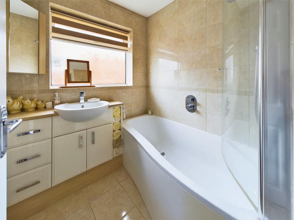 MODERN BATHROOM West aspect. Comprising obscure glass pvcu double glazed window, panel enclosed bath having an integrated shower over, hand wash basin with vanity unit below, fully tiled walls, tiled flooring, wall mounted heated towel rail.