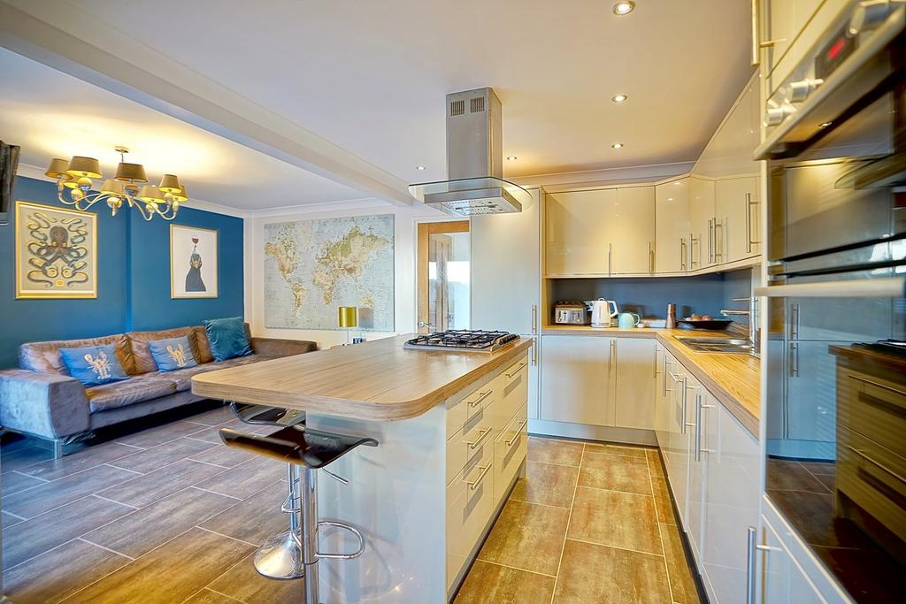 A light open plan contemporary space with UPVC window to rear aspect and French doors to garden terrace to the rear, fitted in a range of contemporary gloss base and wall mounted cabinets with complementing work surfaces and up-stands, glass splashbacks, central island with integral five ring gas hob and suspended extractor unit above, drawers and pan drawers, UPVC door to rear garden, recessed lighting, coving to ceiling, double electric Bosch oven, single drainer one and a half bowl stainless steel sink unit with mixer tap, under unit lighting, integrated automatic dishwasher, fridge freezer, fitted microwave, Karndean flooring, inner door to