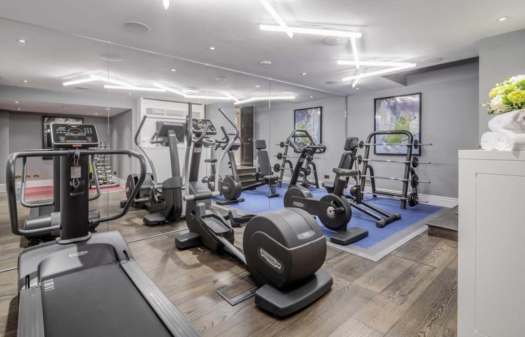 The lower level houses a wine cellar, utility room, and leisure facilities, including a gym, jacuzzi, steam room, and sauna. At the back of the house are a media room, study, and secure off-street parking for three cars and a separate garage.