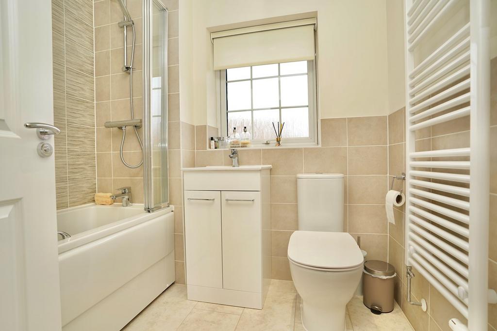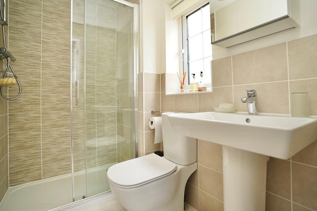 Fitted in a three piece white suite comprising low level WC, pedestal wash hand basin with mixer tap, shaver point, UPVC window to side aspect, oversized screened shower enclosure with independent shower unit fitted over, recessed lighting, extractor, heated towel rail, porcelain floor tiling.