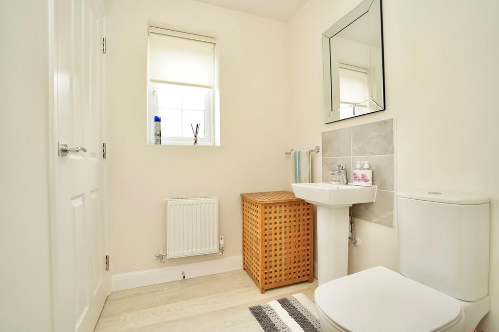 Fitted in a two piece contemporary white suite comprising low level WC, pedestal wash hand basin with mixer tap and tiling, UPVC window to side aspect, double panel radiator, recessed lighting, large understairs storage cupboard, Amtico flooring.