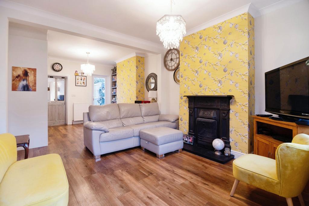 The entrance leads to a warm and inviting lounge/diner featuring wood flooring, a cast iron fireplace, and bespoke fitted under stairs storage. The modern kitchen includes a range of appliances and opens to a luxury bathroom with a floor-standing bath, fully tiled shower cubicle, and contemporary fixtures.