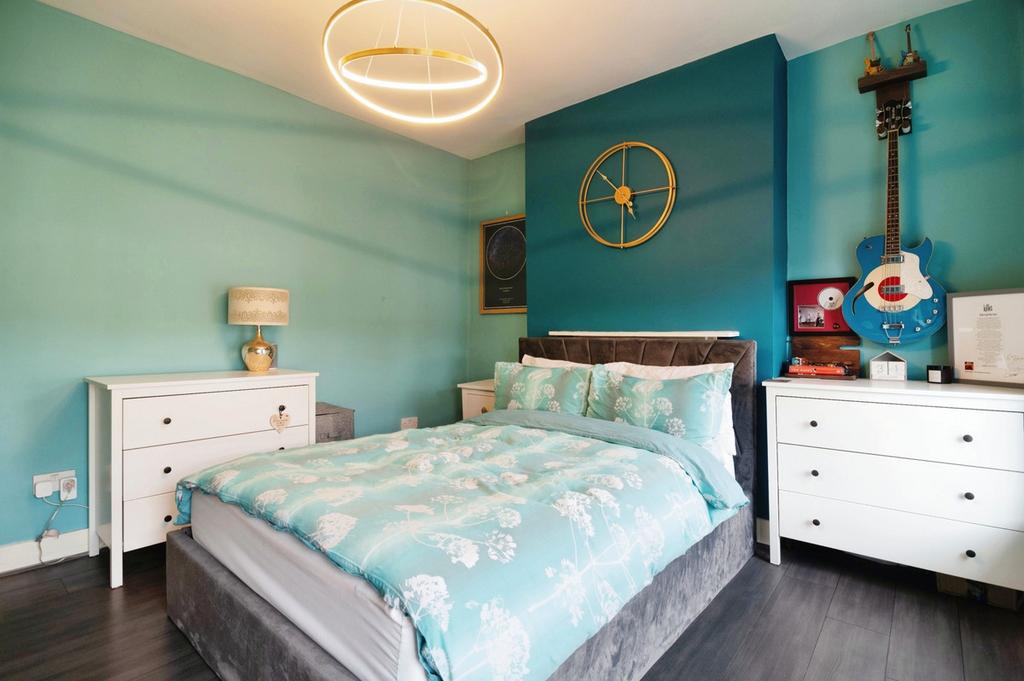 The first floor landing leads to two double bedrooms. Bedroom one boasts two double glazed windows, wood flooring, and a feature fireplace, while bedroom two features built-in storage and wood flooring. Both rooms are elegantly appointed, creating comfortable retreats.