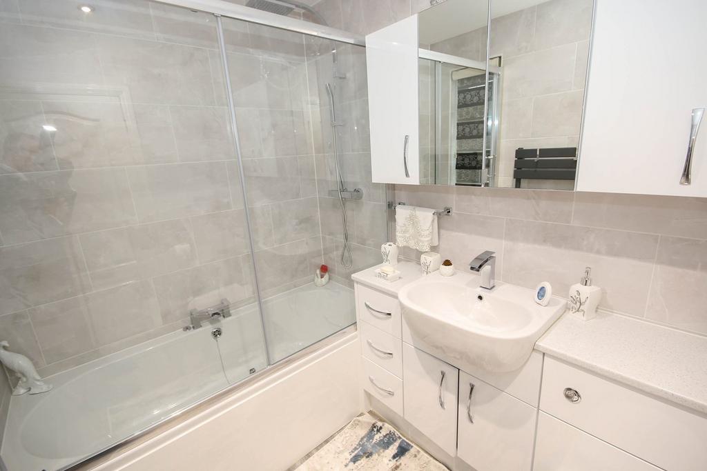 2.1m x 1.63m (6' 11" x 5' 4") Bath with mains 'Rainfall' shower over and full width shower screen, vanity unit with marble top and sink unit with chrome mixer tap and cupboards and drawers under, low level WC with concealed cistern, wall cupboards, heated towel rail, fully tiled walls.
