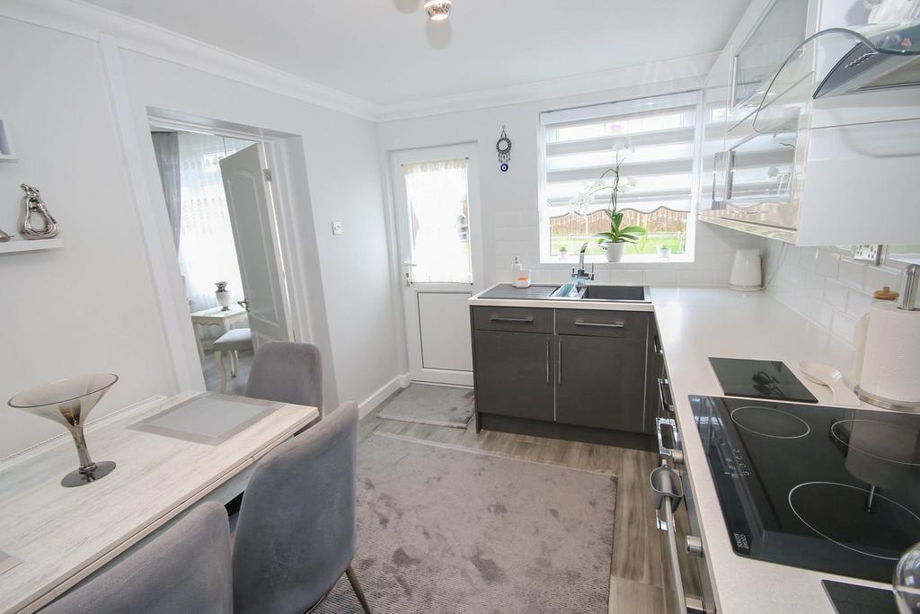 3.90m x 2.41m (12' 10" x 7' 11") L-shaped marble effect worktop with 4 ring ceramic hob and extractor over, 1.5 bowl composite sink unit with chrome mixer tap, slate grey cupboards and drawers under, integrated dishwasher, further matching worktop with cupboard and drawer under, storage cupboards either side, matching wall cupboard, UPVC double glazed door to outside, radiator, opening into the utility.