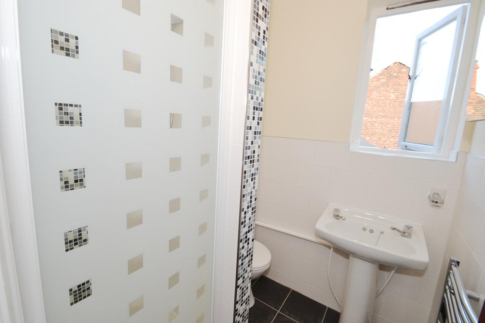 Shower cubicle, WC, and sink.